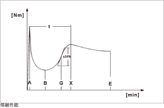 該軟件能夠分析曲線,并確定在轉(zhuǎn)矩曲線(用于測(cè)量粘度)、熱融合時(shí)間、凝膠速度和機(jī)械能輸入這三者中的極值。