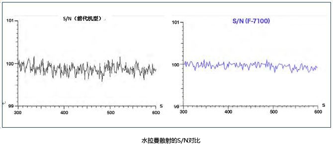 上圖所示是F-7100與F-7000水拉曼散射的S/N對(duì)比情況。F-7100靈敏度是前代機(jī)型的1.5倍,即便是微弱的信號(hào),也能實(shí)現(xiàn)低噪聲檢測(cè)。