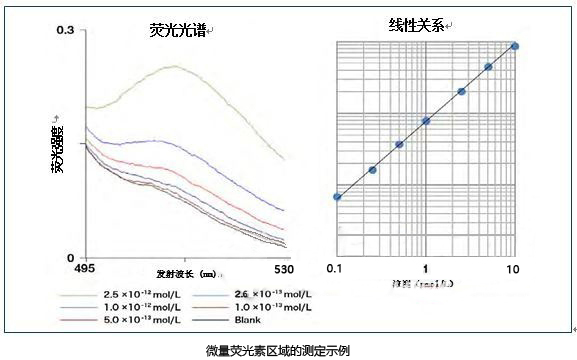 上圖表示以Blank(純水)為參照,超高靈敏度的檢測(cè)示例。使用F-7100 可檢測(cè)低至1×10-13mol/L(亞皮摩爾) 量級(jí)的熒光素。從線性曲線圖可知,即使在超微量區(qū)域,也能獲得很好的線性關(guān)系。
