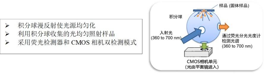 新型熒光分布成像系統(tǒng)可安裝到F-7100熒光分光光度計(jì)的樣品倉內(nèi)。入射 光經(jīng)過積分球的漫反射后均勻照射到樣品,利用F-7100標(biāo)配的熒光檢測器可以獲得樣品熒光光譜,結(jié)合積分球下方的CMOS相機(jī)可獲得樣品圖像,并利用獨(dú)特的AI光譜圖像處理算法,可以同時(shí)得到反射和熒光圖像。