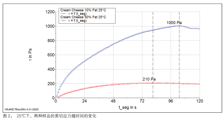 彈性響應(yīng)后,其結(jié)構(gòu)遭到破壞并且剪切應(yīng)力開(kāi)始下降。實(shí)驗(yàn)結(jié)果中剪切應(yīng)力在整個(gè)測(cè)試時(shí)間內(nèi)的最大值就對(duì)應(yīng)了樣品的屈服應(yīng)力。圖 2 是兩種樣品在室溫下的測(cè)試結(jié)果,可以看出,脂肪含量高的樣品的屈服應(yīng)力為 1000Pa,而低脂肪含量樣品的屈服應(yīng)力則為210Pa。而圖 3 則是兩種樣品在較低溫度下(8℃)的結(jié)果,相當(dāng)于樣品剛從冰箱內(nèi)取出的溫度。其結(jié)果表明高、低脂肪含量的樣品在此溫度下的屈服應(yīng)力都有所上升,分別為 1500Pa 和 370Pa。結(jié)合上述結(jié)果,當(dāng)考慮將此類食品涂抹在某些剪切模量低至1200Pa 白面包上時(shí)就會(huì)出現(xiàn)問(wèn)題,因?yàn)樵诶洳貤l件下的奶油奶酪的屈服應(yīng)力遠(yuǎn)大于面包所能承受的剪切模量。