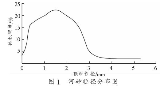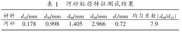 對本次試驗選用的河砂進(jìn)行物理特性測試,包括密度、 孔隙率和粒徑分布。 測得河砂密實密度2.66 g/cm 3 ,松散密度 1.59 g/cm 3 ,孔隙率 40.11% 。 表1 為河砂粒徑特征測試結(jié)果。