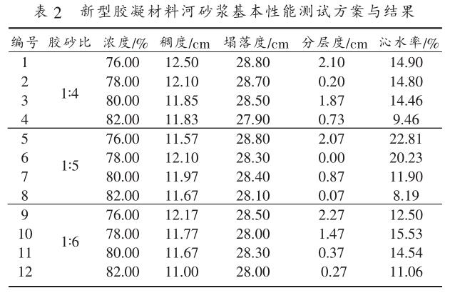 新型膠凝砂漿基本性能測試包括砂漿稠度、砂漿分層度、砂漿塌落度、砂漿沁水率,同時與水泥河砂漿基本性能進(jìn)行對比。 砂漿基本性能測試方案與結(jié)果如表 2 和表 3 所示。