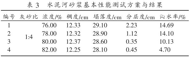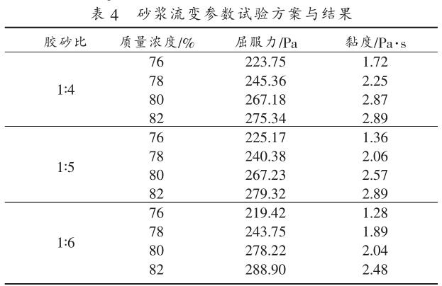 通過流變儀對膠砂比分別為 1∶4 、 1∶5 和 1∶6 ,質(zhì)量濃度 76%~82% 的砂漿進(jìn)行測試,試驗方案與結(jié)果如表 4 所示。