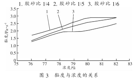 從圖 2 和圖 3 可以看出,膠砂比一定時,充填砂漿的濃度越高,初始應(yīng)力越大,黏度越高;當(dāng)充填砂漿濃度一定時,砂漿的黏度隨膠砂比的提高而減小,需要的初始應(yīng)力也減小,即流動性越好。
