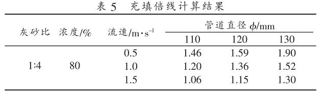 由式( 5 )可以看出,充填倍線 N 與充填料漿的屈服力 τ 0 、黏度 η 和流速 v 成反比,與充填管道直徑D 成正比。 當(dāng)充填管道直徑越大,屈服力、黏度和流速越小時,可充填范圍越大,反之越小。 以灰砂比 1∶4 ,濃度 80% 為例,計算出的充填倍線如表 5 所示。