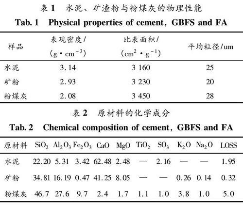 (3) 礦物摻和料: 采用武漢陽(yáng)邏電廠 I 級(jí)粉煤灰以及武鋼礦渣微粉 (簡(jiǎn)稱(chēng)礦粉),其物理性能如表1 所示,化學(xué)成分如表 2 所示。(4) 減水劑: 選用武鋼浩源外加劑廠生產(chǎn)的FDN 萘系磺酸鹽高效減水劑。
