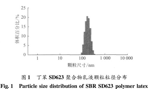 (2) 聚合物乳液: 采用上海 BASF 公司生產(chǎn)的丁苯 SD623 聚合物乳液,其顆粒平均粒徑為 168. 4 nm,具體顆粒粒徑分布如圖 1 所示,聚合物乳液固含量為47%,最低成膜溫度為11 ℃。