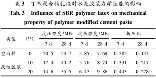 (1) 相比空白樣,聚合物改性水泥膠漿的抗壓強(qiáng)度下降幅度較為明顯,但其抗折強(qiáng)度出現(xiàn)了較大幅度地提高; 20% 聚灰比的聚合物改性水泥膠漿的28 d 折壓比為 0. 278,相對(duì)空白樣水泥膠漿提高了94. 4%,表明丁苯聚合物乳液的加入可顯著提高水泥膠漿的柔韌性,降低其脆性。