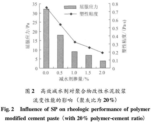 (2) 萘系磺酸鹽高效減水劑對(duì)新拌聚合物改性水泥膠漿的流變性能產(chǎn)生了顯著影響,隨著高效減水劑摻量的不斷提高,聚合物改性水泥膠漿的屈服應(yīng)力與塑性粘度出現(xiàn)明顯降低。