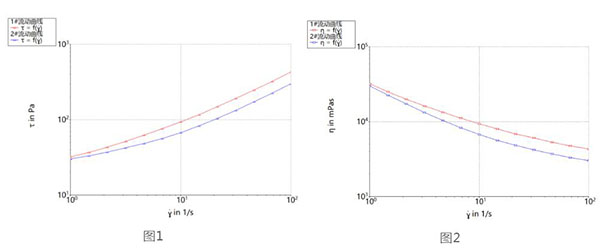 利用旋轉(zhuǎn)流變儀測(cè)試可以得到藥膏劑剪切速率由低到高的流動(dòng)曲線(圖1)和黏度曲線(圖2),可用來(lái)模擬膏劑從管內(nèi)擠出至涂抹的使用情況等,皮膚外用膏劑一般是剪切變稀的假塑性流體,其從低到高剪切速率下對(duì)應(yīng)的黏度過(guò)程,反映了樣品從高黏稠狀態(tài),經(jīng)剪切涂覆為低黏度狀態(tài)的過(guò)程。不同工藝可能會(huì)對(duì)藥物的分散狀態(tài),基質(zhì)的液滴尺寸等造成差異,從而影響其黏度。