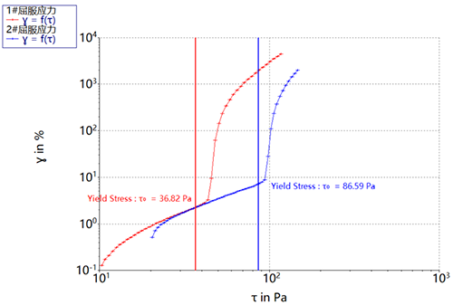 藥膏劑的屈服應(yīng)力是指:當(dāng)流體被施加較小的剪切應(yīng)力時(shí),流體只發(fā)生變形不產(chǎn)生流動(dòng);當(dāng)流體被施加的剪切應(yīng)力增大到某一定值時(shí),流體開始流動(dòng),此時(shí)的剪切應(yīng)力稱為該流體的屈服應(yīng)力。皮膚外用膏劑一般需要一定的力才能從外管中擠出,這是因?yàn)闃悠肪哂星?yīng)力。屈服應(yīng)力的存在,確保了樣品能夠維持一定的外觀形狀,不易從外管中自然流出。屈服應(yīng)力的大小不僅影響擠出的手感,甚至影響藥物有效成分從基質(zhì)中析出的難易程度。旋轉(zhuǎn)流變儀測(cè)定樣品的屈服應(yīng)力(圖3),對(duì)分析樣品的儲(chǔ)藏穩(wěn)定性、涂抹性等具有重要的參考意義。