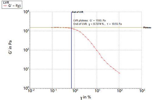 皮膚外用膏劑除了黏性流動(dòng)之外,在一定條件下還會(huì)表現(xiàn)為彈性變形特性,即存在著黏彈性。測(cè)試藥膏劑的線性黏彈區(qū)(LVR),可以表征樣品穩(wěn)定性情況,一旦施加的力或形變超過(guò)LVR(圖6),材料內(nèi)部即發(fā)生一定程度的破壞,模量降低,黏度降低。一般LVR區(qū)越寬,樣品越穩(wěn)定,分散體系越不容易沉降或者分層。
