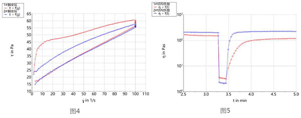 觸變性是表征樣品由于剪切作用造成黏度降低后的自行恢復(fù)能力。皮膚外用膏劑的觸變性表現(xiàn)為,涂抹前膏劑呈現(xiàn)高黏稠半固體狀態(tài),一般能夠維持一定的形狀;涂抹剪切后黏度降低,在皮膚上流平;涂抹結(jié)束后黏度又恢復(fù)到高黏稠狀態(tài),從而黏附在皮膚上不至于從皮膚上滴落。觸變性一般通過(guò)觸變環(huán)(圖4)和三段式(圖5)兩種方式來(lái)進(jìn)行測(cè)試,兩種方式有各自的適用性。旋轉(zhuǎn)流變儀測(cè)定藥膏劑的觸變性,可以表征藥膏劑的涂覆性、結(jié)構(gòu)恢復(fù)特性等,從而評(píng)價(jià)藥膏劑的使用。