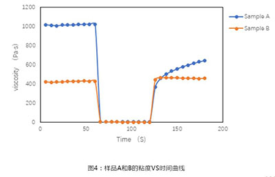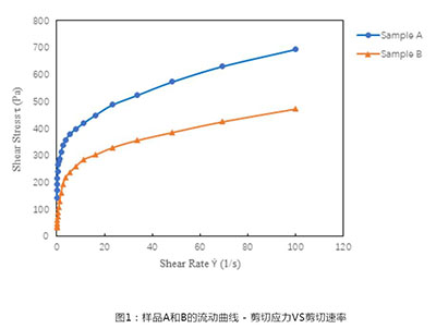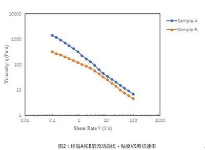 設置剪切率掃描范圍為0.1-100S-1,根據(jù)圖1(剪切應力VS剪切速率)和圖2(粘度VS剪切速率)可知,樣品A和B均屬于典型的剪切變稀流體,當剪切速率增加時,樣品的粘度下降。