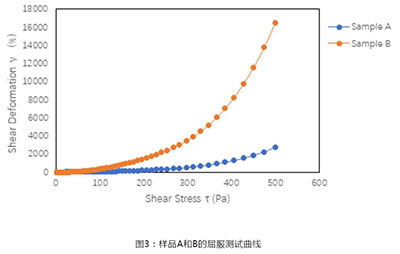 屈服應力是指流體在剪切應力的作用下發(fā)生形變的閾值。通過繪制應力-應變曲線(如圖3所示),使用Rheo3000軟件計算,樣品A和樣品B的屈服應力分別為122.6Pa,65.2Pa。屈服應力越大,表明樣品越不易流動。屈服應力有助于保持多相混合體系的穩(wěn)定性,防止粒子沉降,延長產(chǎn)品保質期。