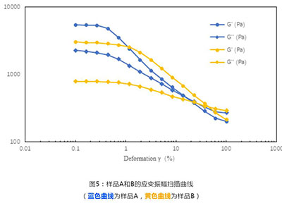 掃描頻率為1Hz,在應變范圍為0.1%~100%內(nèi)對兩種膏體樣品(本案例為牙膏)進行振幅掃描。掃描圖譜如圖5所示:這兩種樣品的線性粘彈區(qū)間在0.1%~0.5%之間。在該范圍內(nèi),儲能模量大于損耗模量,說明在低剪切條件下,這兩種樣品不易流動,性質穩(wěn)定。隨著應變幅度的增加,儲能模量逐漸降低,損耗模量增加,兩條曲線相交,樣品的流動性逐漸增加。
