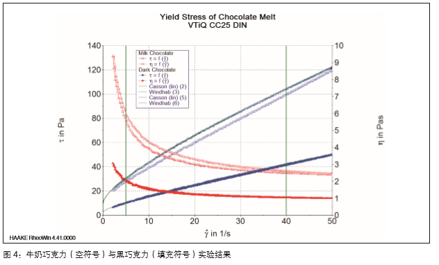 按照 ICA 第 46 條標(biāo)準(zhǔn)制備了兩種巧克力樣品,一種是牛 奶巧克力,另一種是黑巧克力。將兩種樣品切成片,放 進(jìn)密封的玻璃容器中,然后將玻璃容器在 52℃的爐子中 放置45-60 分鐘。同時(shí),將測(cè)量杯和轉(zhuǎn)子在Viscotester iQ 的帕爾貼溫控單元中預(yù)加熱到 40℃。 這個(gè)實(shí)驗(yàn)中采用的測(cè)量夾具為CC25 DIN Ti(直徑 25mm 鈦合金同軸圓筒). 這個(gè)小尺寸同軸圓筒體系只 需要 16.1 毫升的樣品,而且可以很容易的拆卸及清理。 測(cè)試方法按照ICA 第 46 條標(biāo)準(zhǔn)轉(zhuǎn)換成賽默飛 TM 哈克 TM RheoWinTM軟件的標(biāo)準(zhǔn)程序。剪切速率范圍見(jiàn)圖2所示。 哈克 TM RheoWinTM 程序(圖 3)包三部分內(nèi)容:樣品條 件,測(cè)試及評(píng)估。樣品條件應(yīng)該始終保留在程序序列中, 以防止忘記并保證所有測(cè)試都按此條件進(jìn)行從而保證測(cè) 試結(jié)果的重復(fù)性。在測(cè)試條件這一部分中(步驟 1-4),