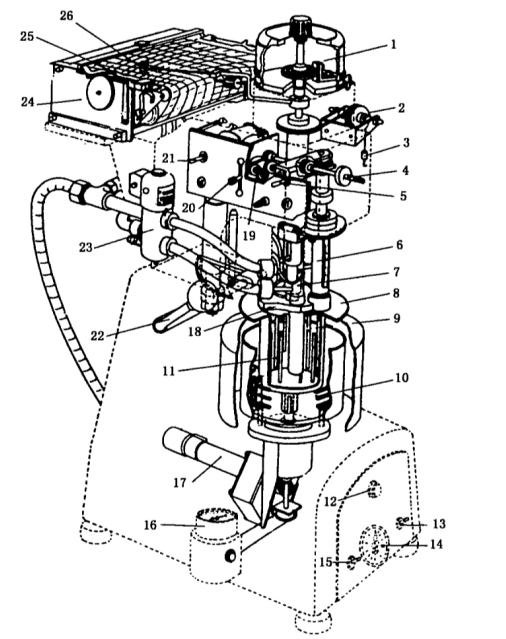 5.7.7 關(guān)閉電源。將攪拌器與傳感豎軸外開(kāi),將冷卻套桿提升至最高處,然后壓下升降柄抬起儀器上半部并使向右轉(zhuǎn)動(dòng) 90°。