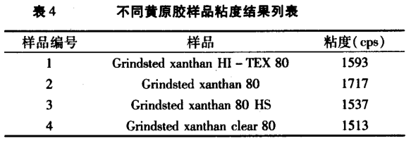 1%黃原膠溶于 1% 氯化鉀溶液,25℃,粘度測(cè)試結(jié)果,見表 4。