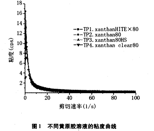 將剪切速率和粘度作圖,得到不同黃原膠溶液的粘度曲線,見圖 1。