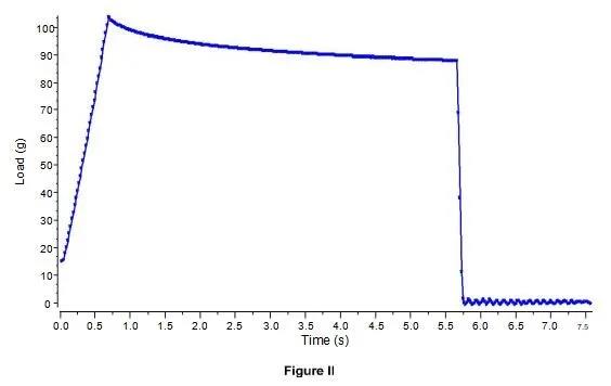 通過圖形可知,探針進入樣品,當達到5克的觸發(fā)力時開始記錄數(shù)據(jù),直到達到150克的力探頭靜止保持5秒,然后探針以4.5mm/s的速度從樣品中取出。穿透的距離取決于樣品的硬度,較大的穿透距離表明樣品較軟,而小的穿透距離表明樣品較硬。該測試有助于比較不同蠟的硬度,以確定不同特定產(chǎn)品對蠟的選擇。