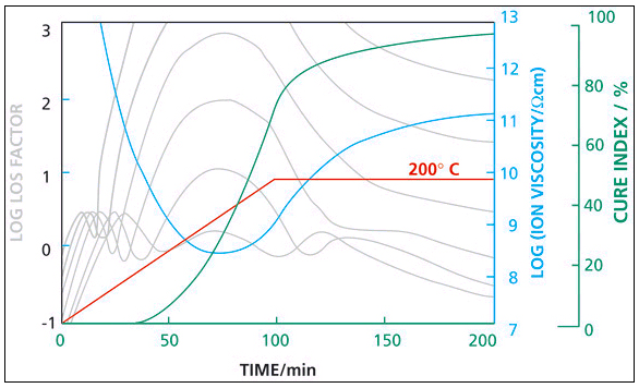 使用 DEA,可以方便地監(jiān)測(cè)樹脂在固化工藝過程中的如下參數(shù)及其變化:流動(dòng)性/粘度變化;起始固化點(diǎn);凝膠點(diǎn);后固化過程。借助獨(dú)特的離子粘度曲線,該技術(shù)可對(duì)材料的固化進(jìn)程進(jìn)行實(shí)時(shí)監(jiān)控與表征,以及計(jì)算固化轉(zhuǎn)化率隨工藝進(jìn)程的變化。