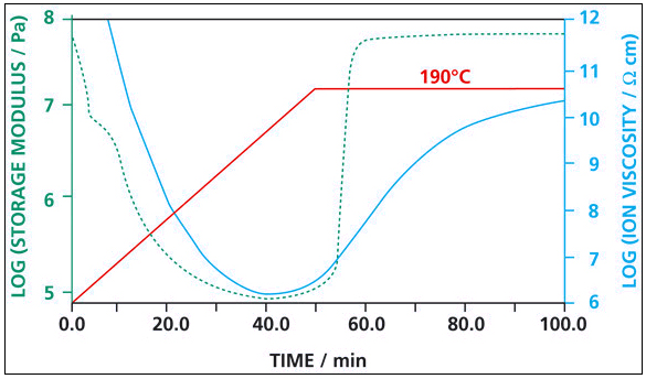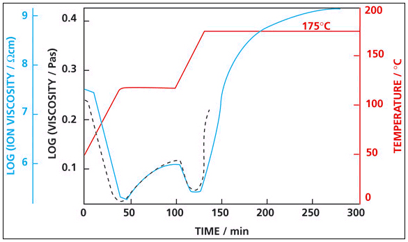 圖中比較了環(huán)氧樹脂-石墨復(fù)合體系固化反應(yīng)的 DEA 曲線與流變測(cè)量曲線,最初的 150min 內(nèi)動(dòng)態(tài)粘度(流變儀數(shù)據(jù))與離子粘度曲線(DEA數(shù)據(jù))幾乎重合,表明了這兩者之間的測(cè)量是一致的。從 175°C 恒溫開始,環(huán)氧樹脂膠凝到一定程度后,則無法進(jìn)行動(dòng)態(tài)粘度測(cè)量(超出流變儀量程)。而隨著固化進(jìn)程可以繼續(xù)得到離子粘度曲線,甚至在材料固化進(jìn)入堅(jiān)硬的玻璃態(tài)后仍能測(cè)量。可見,DEA是唯一能夠監(jiān)測(cè)固化全過程的方法。