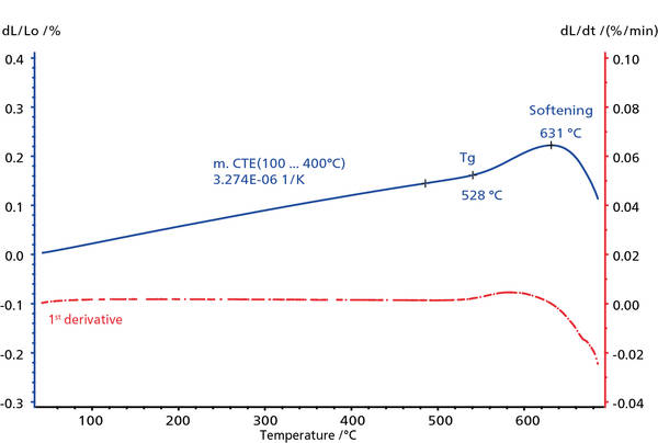硅酸硼材料具有低膨脹、高度抗沖擊等眾所周知的特性。此外,這種玻璃制品還具有優(yōu)異的光學、化學和機械性能,能夠應用在植入式醫(yī)療器械和太空探索等對產品具有較高要求的領域。下圖顯示了硅酸硼玻璃在室溫至 700°C 之間的熱膨脹過程。在 528°C(起始點)時,檢測到了樣品的玻璃化轉變,軟化則發(fā)生在 631°C。