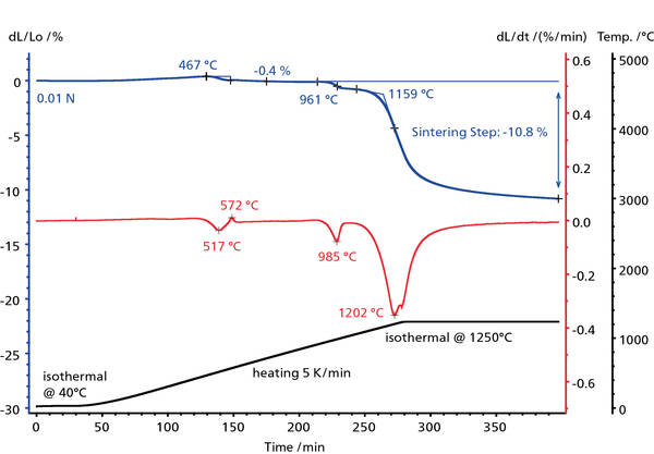 在瓷器生坯的加熱過程中,高嶺土的脫羥基過程發(fā)生在 450°C 至 570°C 之間,在這個過程中形成了莫來石結構(熱膨脹的峰值溫度為 467°C(藍色曲線),對應一階微分曲線上的峰值溫度為 517°C(紅色曲線))。在這個溫度范圍內,由于粘土晶體結構中結晶水的釋放從而導致了樣品大約 0.4% 的收縮。一階微分曲線上峰值溫度為 572°C 的峰體現(xiàn)了石英α晶型→β晶型的轉變。通過進一步觀察,在 961°C 發(fā)生的效應(藍色曲線),對應一階微分上峰值溫度為 985°C(紅色)的峰是由于高嶺土結構的破壞和 γ-Al2O3 的形成[1]。隨著長石的完全熔化和莫來石的形成,1159°C 開始的兩個燒結步驟的總收縮率為 10.8%。