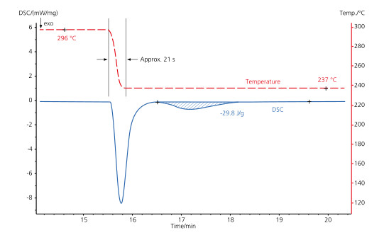 DSC 214 Polyma 配合 IC70 機(jī)械制冷,測(cè)試 PA66 GF30(30%wt 玻璃纖維)的等溫結(jié)晶過程。較低的爐體熱質(zhì)量,使得爐腔內(nèi)部可在幾秒內(nèi)實(shí)現(xiàn) 60℃ 的降溫。在這個(gè)前提下,才有可能將 PA66 的結(jié)晶過程(17min 附近的結(jié)晶峰)和溫度調(diào)整引起的曲線波動(dòng)(15.4min 至 16min 之間的曲線波動(dòng))分開。同時(shí)從溫度曲線可見,在急速降溫時(shí)溫度過沖極小,說明 DSC214 Polyma 具有杰出的冷卻性能。