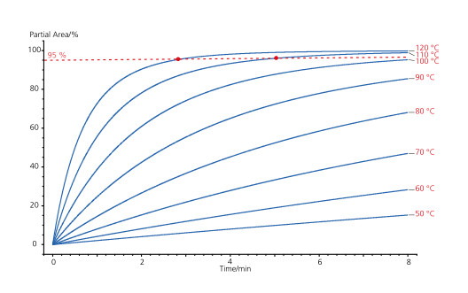 下圖顯示的是不同溫度下恒溫時(shí)樣品的固化度隨時(shí)間的變化,由軟件基于動(dòng)力學(xué)模型計(jì)算得到。在 120℃ 下恒溫 3min,樣品的固化度即達(dá) 95%,而在 110℃ 下達(dá)到同等固化程度需要恒溫 5min 以上。