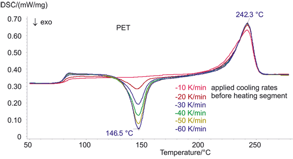 聚對苯二甲酸乙二醇酯(PET)是一種結(jié)晶速率相對較慢的半結(jié)晶性熱塑性高分子。在 DSC 中可以測出其非晶態(tài)部分(Tg 75°C~85°C)和晶態(tài)部分(重結(jié)晶 146°C,熔融 242°C)的不同比例。圖中顯示的是熔融后的 PET 以不同降溫速率冷卻后二次升溫的 DSC 譜圖,可見冷卻速率對 PET 結(jié)晶行為的影響。DSC 204 F1 可以自動計算出樣品的結(jié)晶度。這里使用的是配有機械制冷的 DSC 204 F1 Phoenix®。