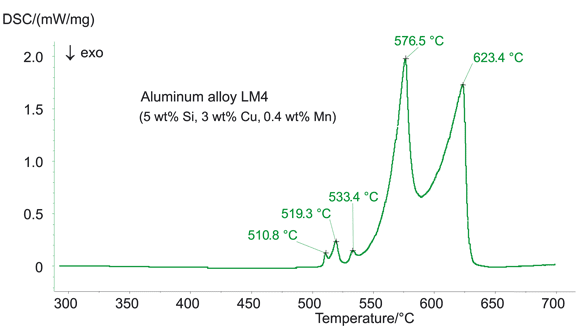 對于現(xiàn)代金屬合金分析而言,能夠很好的分開各個獨立組成的熔融峰是十分重要的,配有τ型傳感器的 DSC 204 F1 Phoenix® 便可以實現(xiàn)這一點。圖例是鋁合金DSC曲線,表明在 510°C~650°C 熔融范圍內(nèi)各熔融峰之間清晰地被分離。