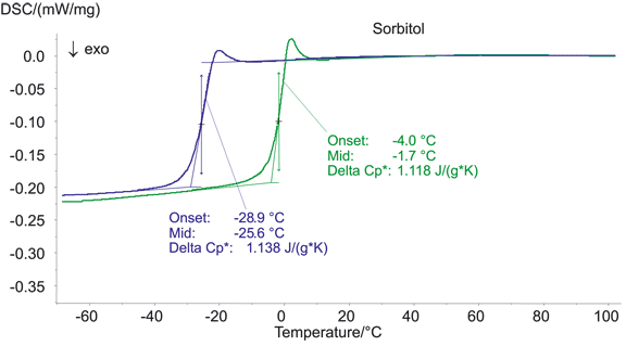 在大量的食品藥品中山梨醇被用于食糖的代替品。在無水山梨醇中加入 5.5% 的水后,玻璃化轉(zhuǎn)變溫度從 -1.7°C 降到了 -25.6°C,迅速冷卻后再次升溫仍能保持無定形態(tài)。