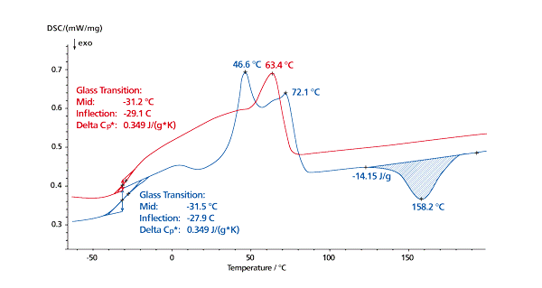 二次升溫時(紅色曲線),玻璃化轉(zhuǎn)變溫度與一次升溫幾乎相同。介于 40℃ 至 80℃ 之間的雙吸熱峰轉(zhuǎn)變?yōu)閷捈绶?,峰值溫度?63℃。晶層越厚,熔融溫度越高。因此,單吸熱峰到寬肩峰的轉(zhuǎn)變表明,由于第一次熱處理,樣品晶層厚度變薄。二次加熱過程中,沒有出現(xiàn)放熱反應(yīng)峰,說明放熱交聯(lián)反應(yīng)在一次升溫時已經(jīng)完成。