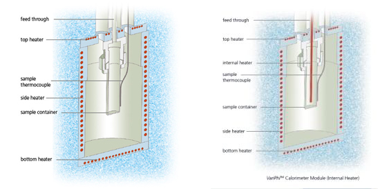 在管狀或球形容器中放置若干毫升的樣品。容器由完整的框架加熱系統(tǒng)所圍繞。在大多數(shù)測量模式下,框架加熱系統(tǒng)的溫度控制在與樣品溫度相同。此時(shí)在外圍加熱器與樣品之間沒有溫差,樣品釋放的所有熱量將停留在樣品內(nèi)部(即模擬絕熱環(huán)境)。