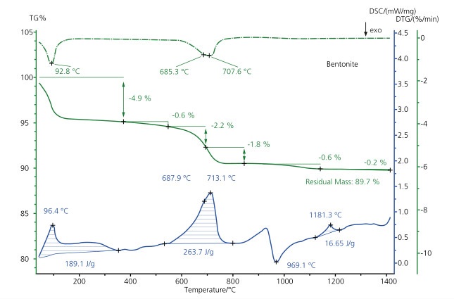 斑脫巖是一種粘土,主要由膠嶺石所組成,由于其吸附能力而為人稱道。該礦物材料常被應(yīng)用于粘合劑,凈化器等領(lǐng)域。本圖中綠色曲線為 TG,綠色點(diǎn)狀線為 DTG,藍(lán)色曲線為 DSC 曲線。第一失重步驟(DSC 峰值溫度 96℃)由水的釋放所引起,隨后有一 0.6% 的小的失重過(guò)程,很可能由有機(jī)雜質(zhì)裂解所引起,表明材料中含有少量黃鐵礦雜質(zhì)。在 600℃ 以上,水從斑脫巖結(jié)構(gòu)中釋放出來(lái)(DTG 峰溫 685℃ 與 708℃)。DSC 曲線在 969℃ 的放熱峰代表了該礦物的相轉(zhuǎn)變。1181℃ 的吸熱峰最可能的原因是部分熔融。
