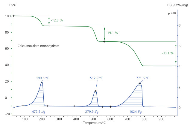 下圖顯示了室溫至 1000℃ 溫度范圍內(nèi),CaC2O4-H2O 的 TGA 與 DSC 曲線。第一階段失重臺(tái)階為脫水過(guò)程,樣品脫水之后轉(zhuǎn)變?yōu)闊o(wú)水草酸鈣(CaC2O4)。第二階段失重臺(tái)階是由 CO 的釋放所致,代表了從草酸鈣向碳酸鈣(CaCO3)的轉(zhuǎn)變。在 700℃ 以上,碳酸鈣分解,釋放 CO2 ;殘余質(zhì)量為氧化鈣(CaO)。實(shí)驗(yàn)測(cè)量到的失重量與理論值非常吻合(偏差 < 1%)。這證明了 STA 449 F5 Jupiter® 熱天平擁有很高的測(cè)量準(zhǔn)確性。