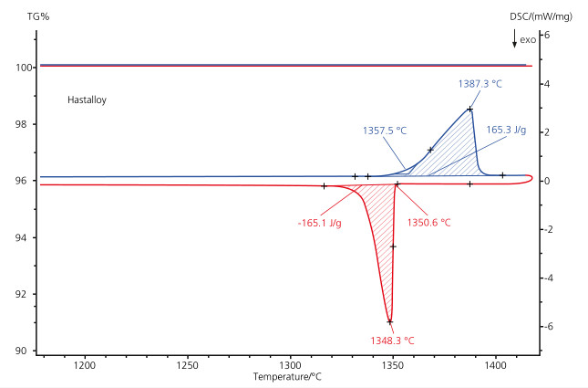 Hastelloy 是一種鎳-鉻-鉬-鎢合金,擁有出色的高溫穩(wěn)定性,即使在高溫下仍具有良好的延展與耐腐蝕等性能。它常被應(yīng)用于可燃?xì)怏w脫硫、化學(xué)工業(yè)、燒灼去菌等。圖中升溫 DSC(藍(lán)色)曲線中可見 Hastelloy 樣品(合金22)的熔融發(fā)生在 1358℃(外推起始點(diǎn)),熱焓 165J/g。降溫 DSC(紅色)曲線可見結(jié)晶過(guò)程發(fā)生在 1351℃(外推起始點(diǎn)),其焓變與熔融過(guò)程幾乎完全相等。升降溫的 TG 曲線均為水平線,未觀察到失重、或由氧化所導(dǎo)致的增重過(guò)程。