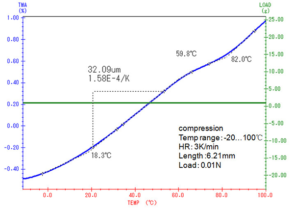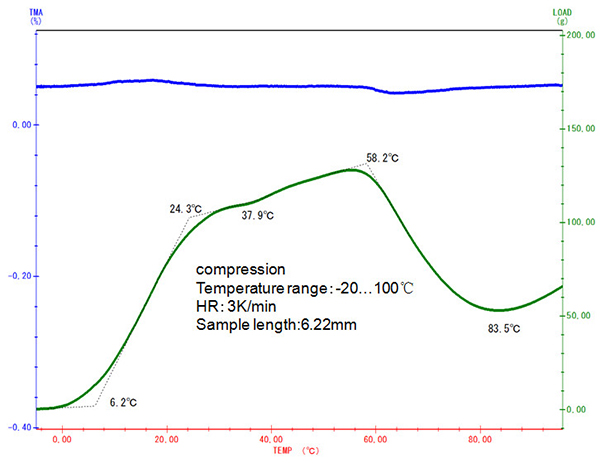 隨著溫度的上升,樣品的自然膨脹趨勢(shì)越來(lái)越大,要維持固定的壓縮形變量所需的力也相應(yīng)增大,直至自 58°C 起樣品發(fā)生玻璃化轉(zhuǎn)變之后,樣品模量下降,所需的負(fù)載力才相應(yīng)下降。
