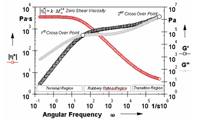 在低剪切或低角頻率下區(qū)域,聚合物的粘度與剪切速率或角頻率無(wú)關(guān),即存在零剪切粘度。零剪切粘度是一個(gè)重要的材料參數(shù),直接和平均分子量 Mw的 3.4 次方成正比。