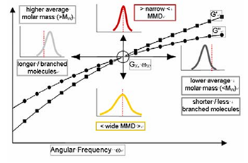 究模量交叉點(diǎn) Gx 的水平位置可以定性分析平均分子量,Gx 的垂直位置說(shuō)明了分子量分布MMD。另外,比較同類聚合物,支化程度也和Gx 的水平偏移有關(guān)。