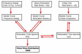 通過(guò)不同溫度下的頻率掃描,應(yīng)力松弛和、蠕變實(shí)驗(yàn),可以計(jì)算主曲線, 從而計(jì)算松弛時(shí)間譜;對(duì)于已知材料參數(shù)的聚合物(如 PS, PE, PP,