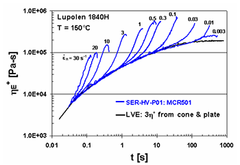 具有優(yōu)異控制速率性能的旋轉(zhuǎn)流變儀,如奧地利安東帕有限公司的 Physica MCR301,可以配置熔體拉伸模具,用來(lái)直接測(cè)量聚合物的拉伸性能,反映樣品支化度的差異。這種差異通常用旋轉(zhuǎn)測(cè)試的流動(dòng)曲線或者振蕩的頻率掃描曲線分辨不出來(lái)或差異很小。