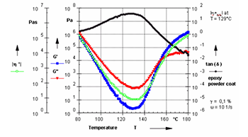 圖 9 為熱固性的環(huán)氧樹(shù)脂隨溫度的變化性能。通過(guò)流變學(xué)參數(shù)如模量或粘度隨溫度變化的曲線,我們可以很方便地判斷環(huán)氧樹(shù)脂的熔融溫度,凝膠化溫度和固化過(guò)程。若在恒定的熔融溫度下,跟蹤環(huán)氧樹(shù)脂的模量或粘度隨時(shí)間變化的曲線,我們可以得到固化時(shí)間和固化動(dòng)力學(xué)的信息。