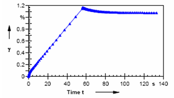 應(yīng)力階梯變化(蠕變及回復(fù))、應(yīng)變階梯變化(應(yīng)力松弛)、速率階梯變化(應(yīng)力增加/開(kāi)始流動(dòng))可以測(cè)量材料對(duì)于給定剪切應(yīng)力、剪切應(yīng)變或剪切速率的時(shí)間(瞬時(shí))響應(yīng)。分析方法包括計(jì)算一些重要的材料參數(shù),如零剪切粘度、平臺(tái)模量、蠕變?nèi)崃亢蛯⑺矐B(tài)材料函數(shù)轉(zhuǎn)換為動(dòng)態(tài)材料函數(shù)- G’(ω)G”(ω)。圖六中,提供了應(yīng)力增加測(cè)試實(shí)例。