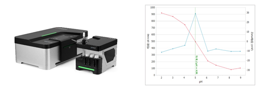 粒度與Zeta電位隨溫度變化趨勢(shì),自動(dòng)檢測(cè)溫度轉(zhuǎn)變點(diǎn)Tm |