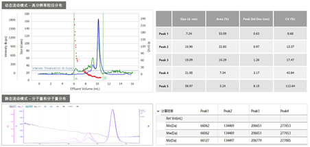 BeNano動靜態(tài)流動模式(Flow Mode)是將納米粒度及Zeta電位儀同一個分離前端(FFF、GPC/SEC)相連接。分離前端可以根據尺寸將樣品進行分離,依次流出。通過檢測每個流出組分的動態(tài)光散射信號和靜態(tài)光散射號,并結合分離前端的示差折光RI或者紫外UV信號,得到高分辨率且不依賴于計算模型的粒徑分布、分子量分布信息。
