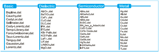 ■ 數(shù)百種材料數(shù)據(jù)庫、多種算法模型庫,涵蓋了目前絕大部分的光電材料。